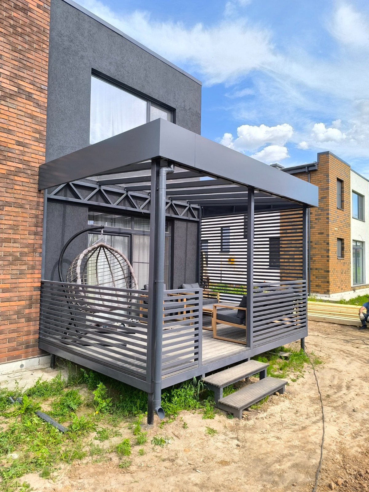Металлокаркас — через партнёров. ДПК-облицовку делаем сами.